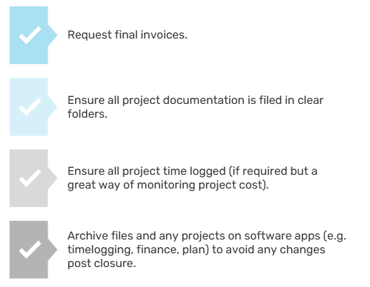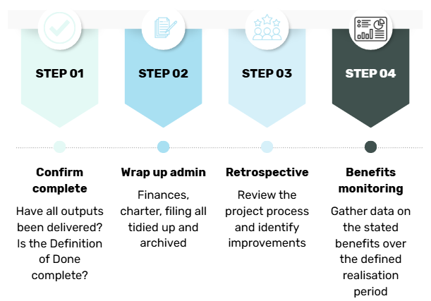 What is Project Closure? It’s actually not just simple ‘closure’, it may feel like that’s what you’d like to do at the end of a project but controlled closure and post delivery beenfits monitoring is critical to ensure: