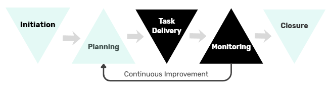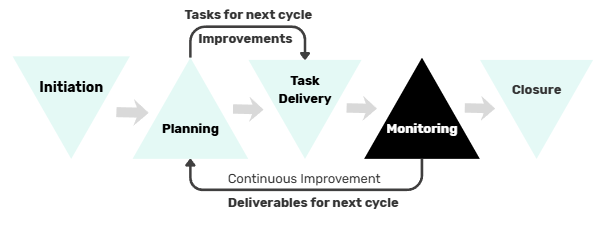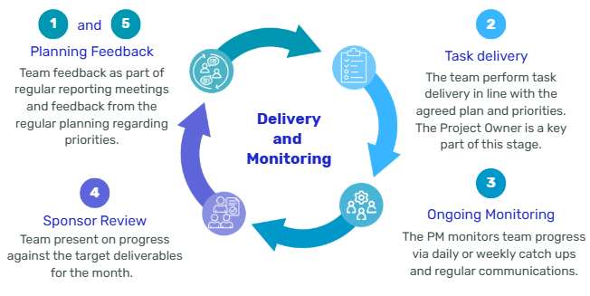 Task delivery and monitoring is an ongoing cycle of doing, checking on progress and feedback into the Planning stage and to the Sponsor.