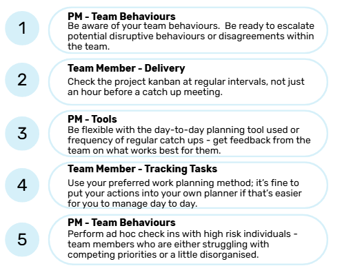 However you break up your project there will always be a need for day-to-day monitoring of some kind. As a PM your role isn’t just to check a kanban or update a spreadsheet, monitoring team behaviour and motivation is crucial for team wellbeing. As a team member you need to keep an eye on your actions and their deadlines.