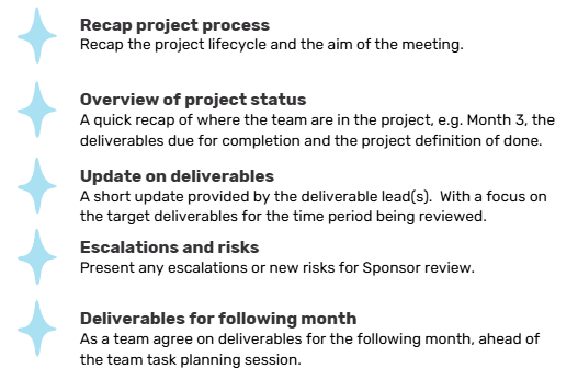 The Sponsor review outputs feed into a planning session (see my planning posts/blog). The planning session aim is for the project team to agree actions and breakdown tasks for the new delivery cycle.