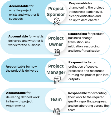 In line with my ethos I like to keep project roles simple and transferrable across frameworks, whilst also ensuring key accountabilities and responsibilities are covered.